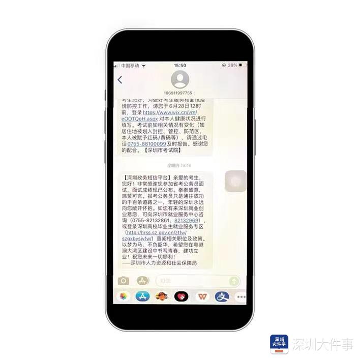 “以前只有考上了才会收到短信,这一次没想到没考上也会收到短信,感觉到深圳的温暖与胸怀。”这两天,报考深圳公务员的应届毕业生陈立江在“小红书”发的一条信息火了,陈立江分享了自己最近收到的一条政务短信——省公务员考试面试“落榜通知”。但这条来自深圳市人力资源和社会保障局的短信却与众不同,格外温暖人心,充满人情味。让网友感叹体会到深圳的温情与包容,及政府的贴心,对人才的重视及关爱。