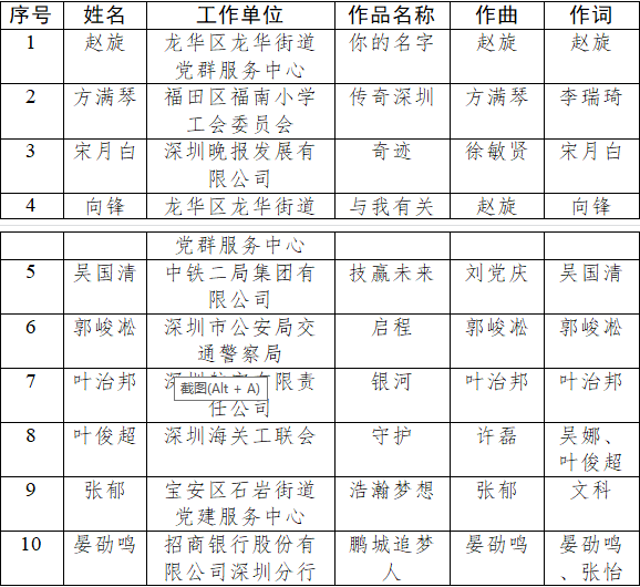深圳市第二届职工音乐节暨深圳职工唱作大赛(创作大赛)日前评选出“十大原创金曲”。经过为期7天的公示,最终,《你的名字》《传奇深圳》《奇迹》等十首歌曲成为创作大赛十大原创金曲。