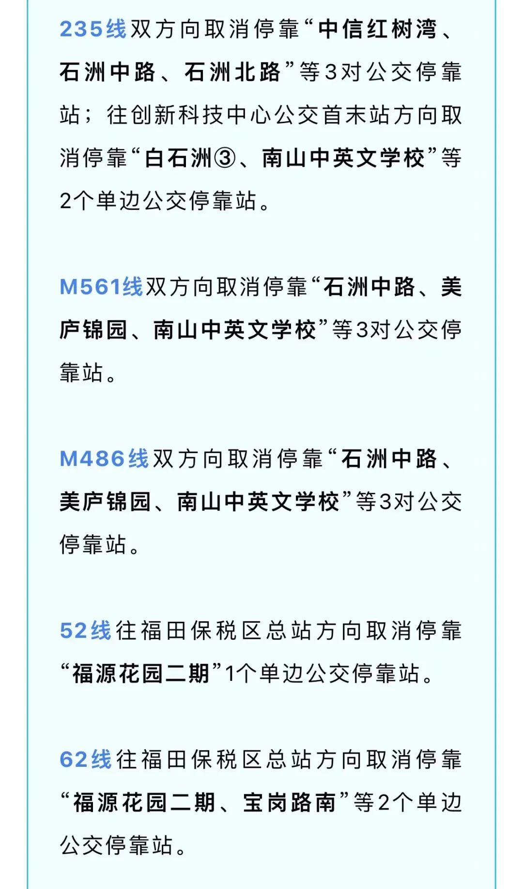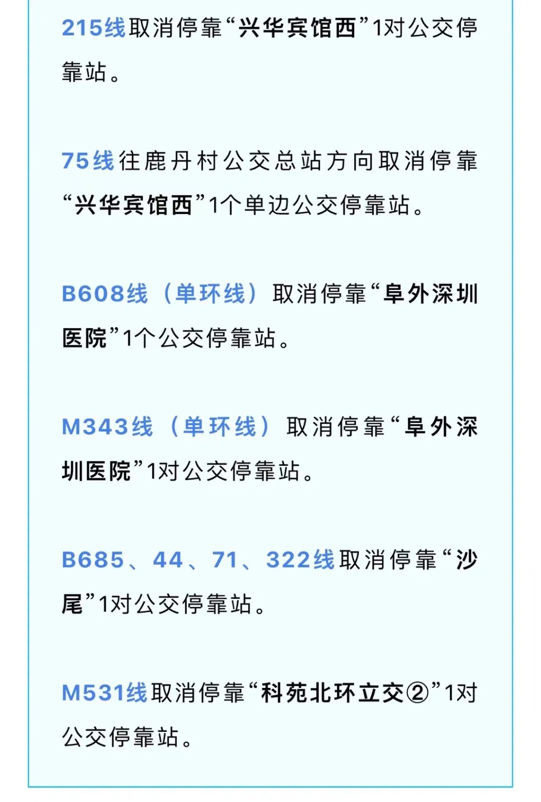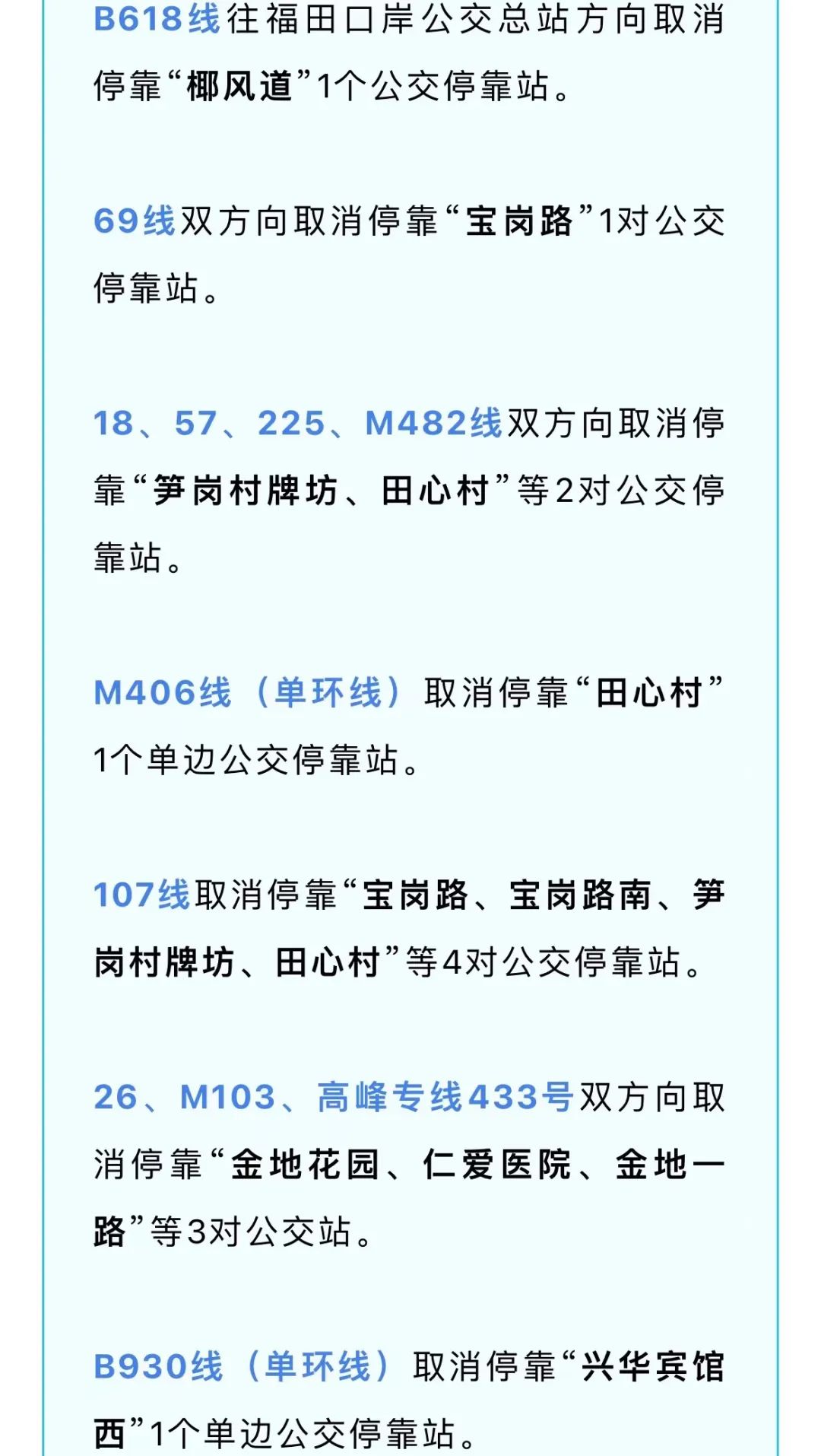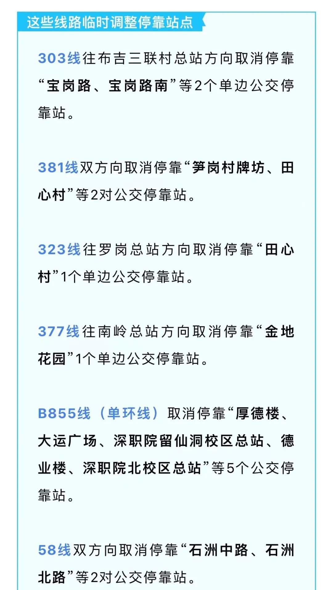以上线路调整工作即日起实施,由于调整情况不断在变化,深圳市公共交通管理局建议市民出行前先用实时公交APP查询相关线运营情况,以免耽误行程。