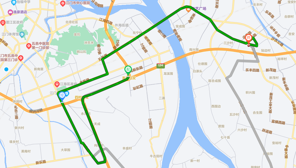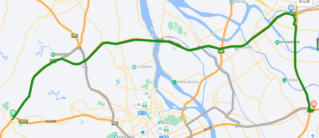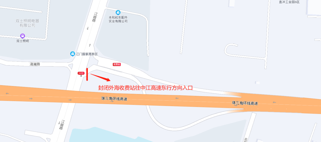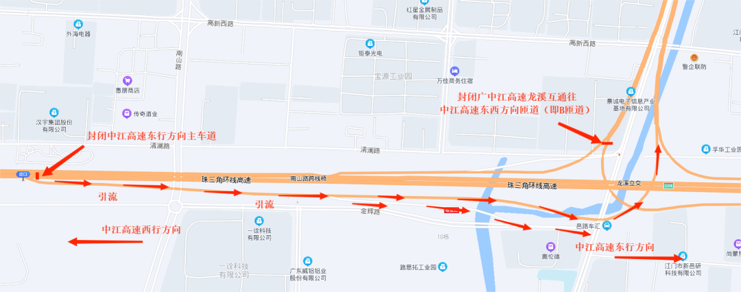 地方道路分流路线:金辉路—龙溪路—五邑路—江海五路—新兴大道西—岐江公路—同兴南路—岐江公路—长安北路
