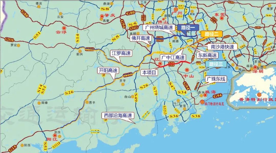 东莞、深圳与江门南部及以西地区之间的往来,主要绕行路径(跨越东莞、深圳、南沙、番禺、中山、顺德、江门、云浮、阳江等区市)有: