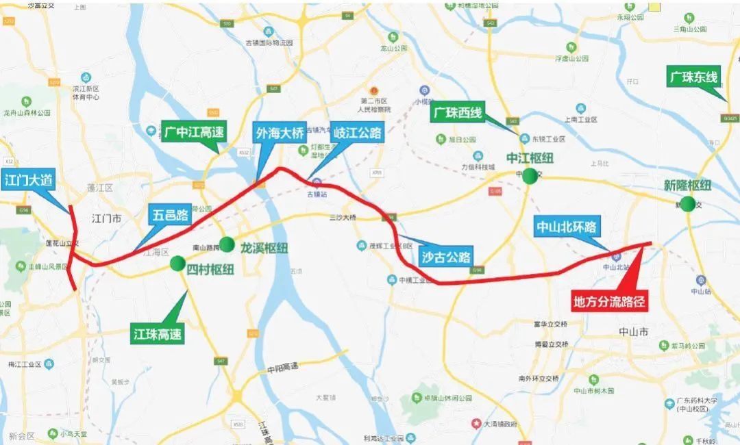 地方道路分流路线:南山南—五邑路—江海五路—新兴大道西—岐江公路—同兴南路—岐江公路—长安北路