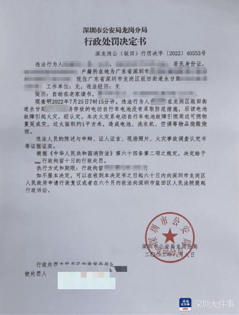 近日,南都记者从相关部门了解到,龙岗区坂田街道一住户因将电动自行车电池带回家中充电引发火灾,于8月8日被公安机关处十日拘留处罚。