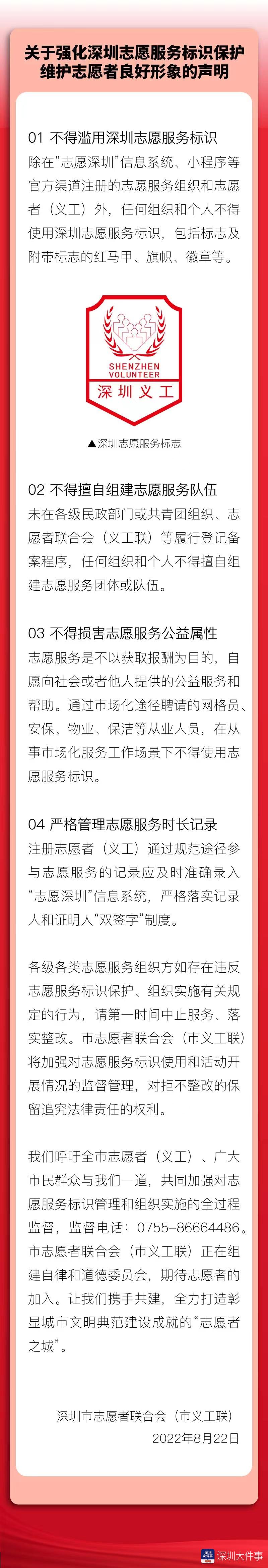 8月22日,深圳市志愿者联合会(市义工联)发布《关于强化深圳志愿服务标识保护维护志愿者良好形象的声明》,其中规定,不得滥用深圳志愿服务标识,除在“志愿深圳”信息系统、小程序等官方渠道注册的志愿服务组织和志愿者(义工)外,任何组织和个人不得使用深圳志愿服务标识,包括标志及附带标志的红马甲、旗帜、徽章等。同时,不得擅自组建志愿服务队伍,未在各级民政部门或共青团组织、志愿者联合会(义工联)等履行登记备案程序,任何组织和个人不得擅自组建志愿服务团体或个体。同时,此外,不得损害志愿服务公益属性,严格管理志愿服务时长记录。
