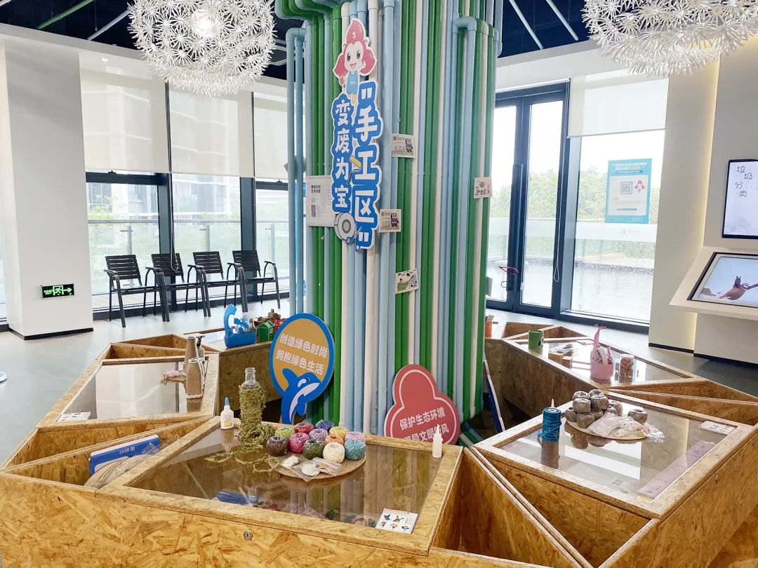 奇妙之旅手工区:通过对矿泉水瓶、牛奶盒、废弃纸壳等生活垃圾变废为宝制作成工艺品,增加小朋友动手能力,了解垃圾分类“神奇魔力”。