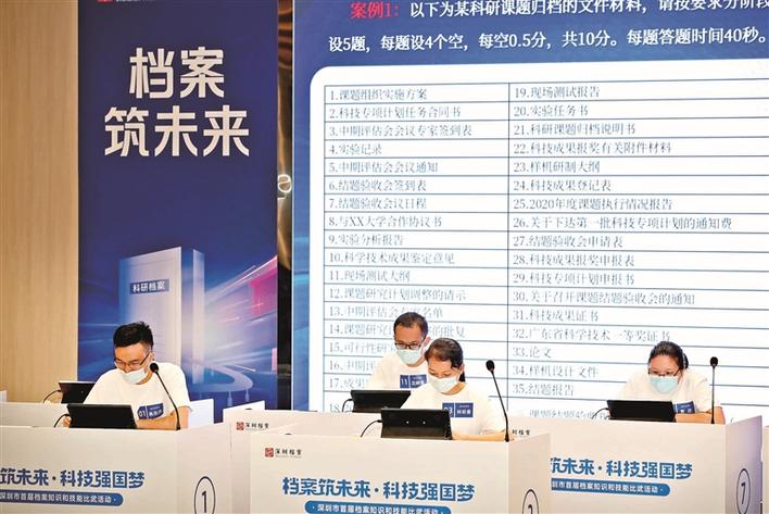 8月23日下午,在光明区文化艺术中心内,全市各单位的档案管理能手们,展开了一场手脑并用的技能大赛,“档案筑未来·科技强国梦——深圳市首届档案知识和技能比武”活动在这里火热进行。市委副秘书长韩荡,光明区委副书记、区长邱浩航,市档案馆馆长林扬,市科创委二级巡视员许建国,光明区副区长周柏新参加活动。