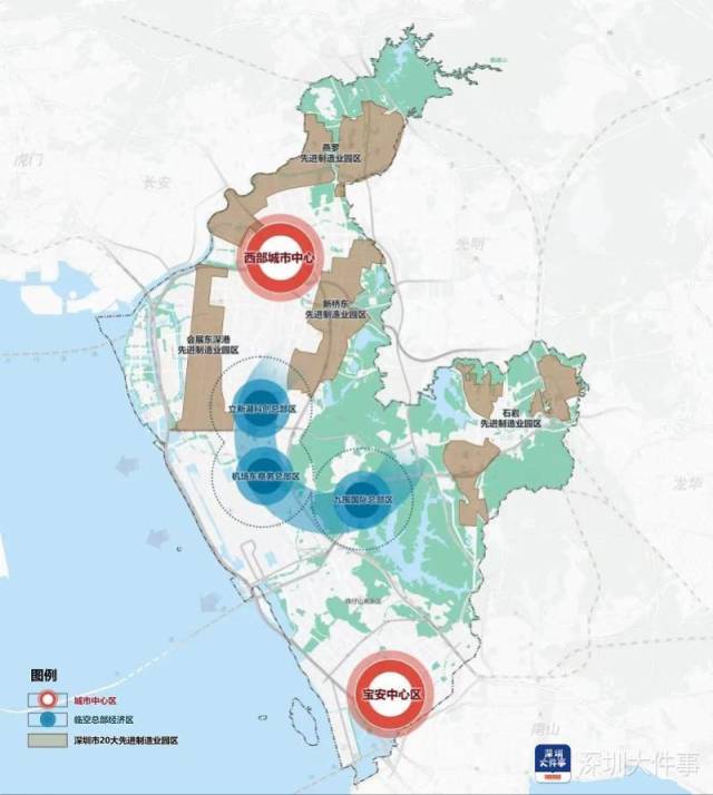 西部城市中心新的城市中心将补足前海和宝安北部城市功能缺失、工业空间保障较弱、职住不平衡的短板,打造与宝安“湾区接口”相匹配的城市环境,提供“民生七优”的生活场所,建设服务约200万人的生活生产中心。此外,还将调整用地结构,重点优化职住关系,完善公共文化服务体系,同时依托细密河涌、滨水绿地、历史古村塑造独特魅力,建设具有广府特色的综合性中心城区,服务北部四大工业片区,集聚创新创业人才,同时辐射带动东莞长安等外围片区,支撑深圳都市圈的建设。