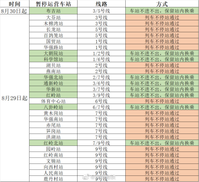 8月30日,深圳地铁发布运营公告:根据新冠疫情防控需要,自2022年8月30日12:00起,深圳地铁3/5号线布吉站暂停运营服务,具体恢复时间待另行通知。深圳地铁停运车站增至29个,所有停运车站关闭出入口,人员不进不出。