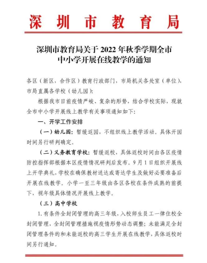 深圳全市中小学开展在线教学,高三全封闭管理