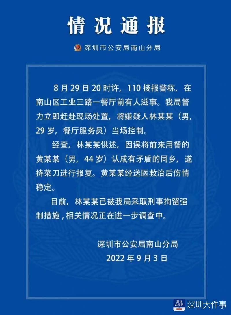 9月3日,深圳市公安局南山分局发布通报称,8月29日20时许,110 接报警称,在南山区工业三路一餐厅前有人滋事。南山公安警力立即赶赴现场处置,将嫌疑人林某某(男,29岁,餐厅服务员)当场控制。
