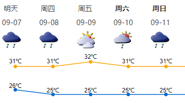 7-8日:云量增多,有阵雨或雷阵雨,高温炎热天气缓解。