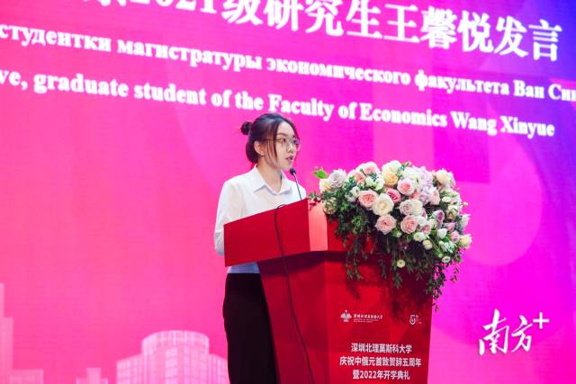 材料科学与工程专业2022级本科生姜靖轩作为新生代表发言。2017级国际经济与贸易专业本科生、2021级硕士研究生王馨悦分享了她在深北莫五年的成长历程。