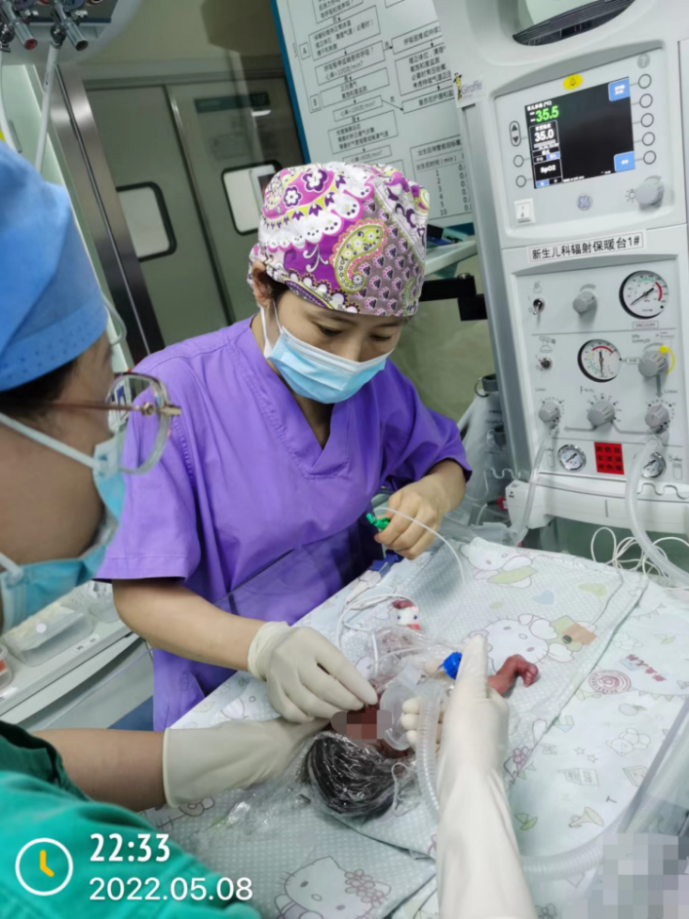 身躯只有巴掌大小,全身青紫不能自主呼吸,皮肤未发育完全如胶冻般泛红,胳膊只有成人手指一般粗细,生命体征微弱……这是乐乐与世界的初见面,由于身体各个器官均未发育完全,抵抗力低下,乐乐一出生就遭遇了新生儿窒息、新生儿呼吸衰竭等风险。面对乐乐的危急情况,医护人员一秒也不敢耽误,立即对其进行了辐射台保暖、保鲜膜包裹、气管插管建立生命通道等一系列抢救措施。