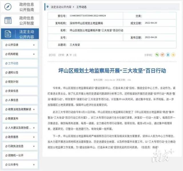 近年来,坪山区规划土地监察局切实践行“守土担责、守土尽责、守土为民”理念,以政务公开为抓手,紧密结合查违工作实际,在历史违建“安坪行动”“两违”整治“春雷行动”、积存案件“清案行动”三大攻坚专项行动中,进一步加大政务公开力度,将政务公开贯穿整个专项行动过程,不断提升查违工作公信力和透明度。