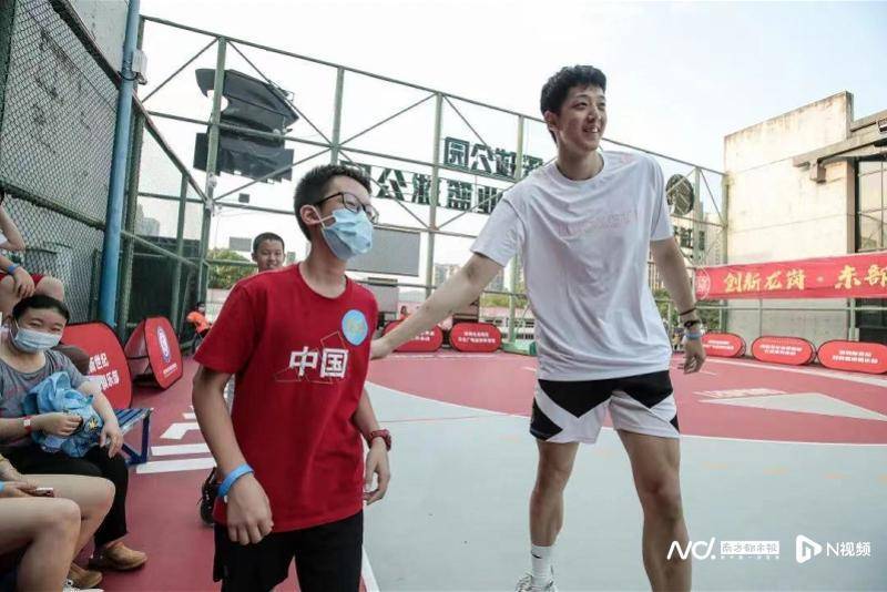 沈梓捷(右一)与小球迷互动。