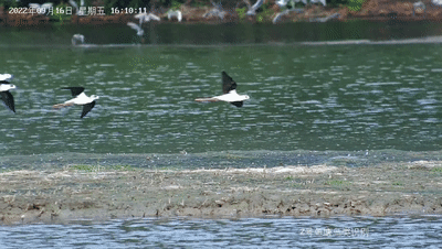 有一群黑翅长脚鹬飞掠而过