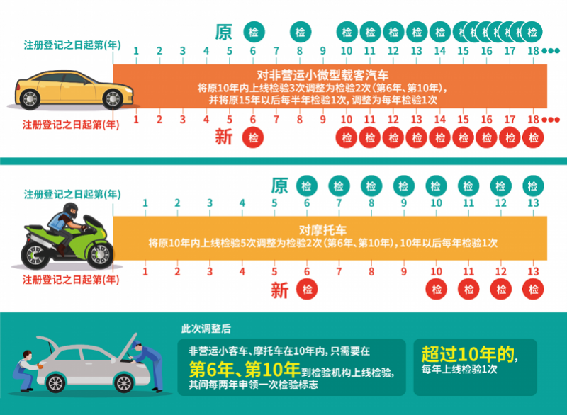 非营运小客车、摩托车只需要自注册登记之日起第6年、第10年到检验机构上线检验,在10年内每两年向公安机关申领一次检验合格标志。