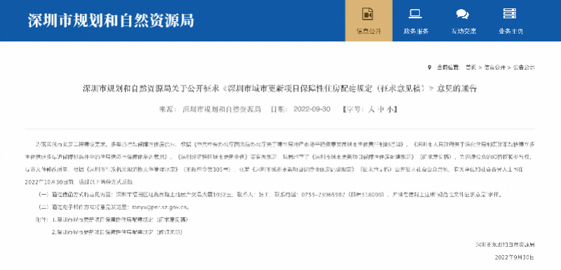 日前,深圳市规划和自然资源局官网发布通告:为落实深圳安居工程建设要求,多渠道增加保障性住房供应,公开征求《深圳市城市更新项目保障性住房配建规定(征求意见稿)》意见。有关单位和社会各界人士可在2022年10月30日前反馈意见。