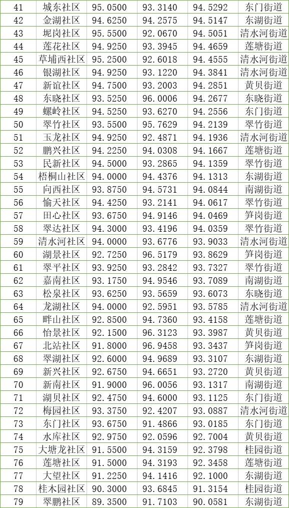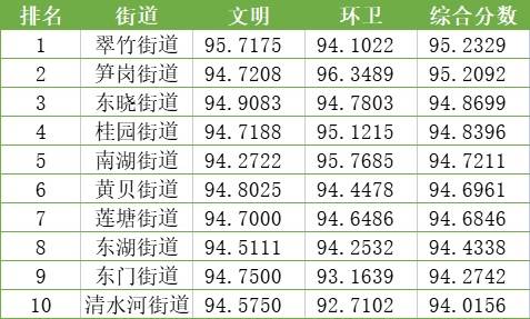 在本次测评中,排名前三的街道依次是:翠竹街道,得分95.2329;笋岗街道,得分95.2092;东晓街道,得分94.8699。