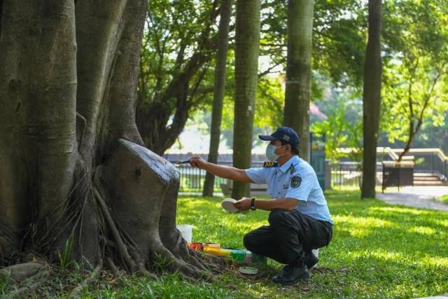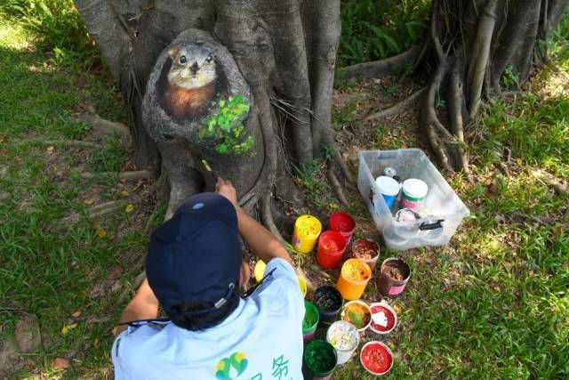 10月9日,在深圳中心公园,李平在榕树的树桩上绘画。