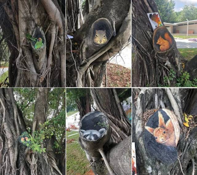 李平在深圳人民公园等公园的树上留下的部分绘画作品(拼版照片)。