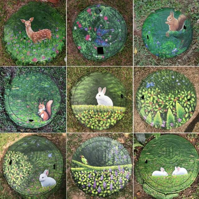 李平在深圳园博园等公园的井盖上留下的部分绘画作品(拼版照片)。