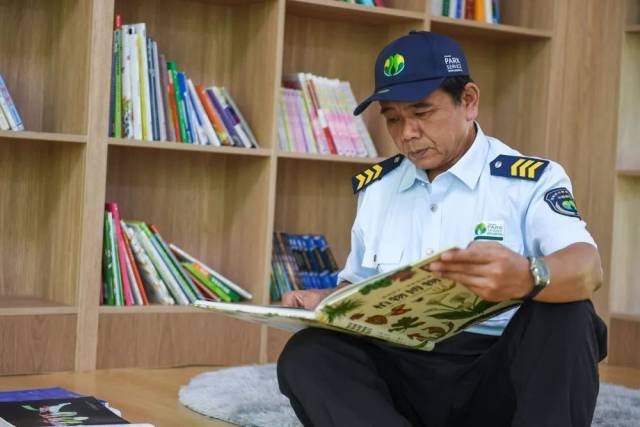 10月9日,在深圳中心公园“风雨轩”书吧,李平在休息时间翻看动植物图集汲取灵感。