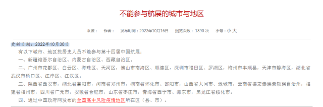 据珠海航展官网信息,截至10月30日,有以下城市、地区旅居史人员不能参与第十四届中国航展: