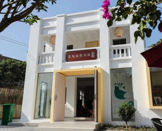 老旧房屋经过改造后,外墙由黄白两色粉刷,金龟自然书房应运而生。把“零废弃”和“自然好书”相结合,作为坪山9家“城市书房”之一,面积342平方米的金龟书房设有室内阅读区、室外活动区、沙龙区等功能区,还兼有自然图书阅读、美术创作、学术讨论、活动交流等公共文化服务功能。