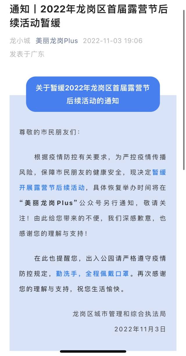 11月3日傍晚,龙岗区城市管理和综合执法局发布《关于暂缓2022年龙岗区首届露营节后续活动的通知》。