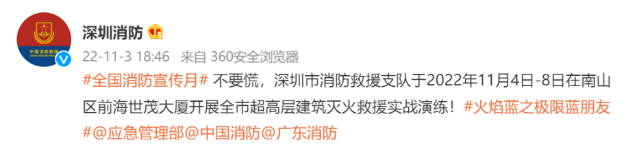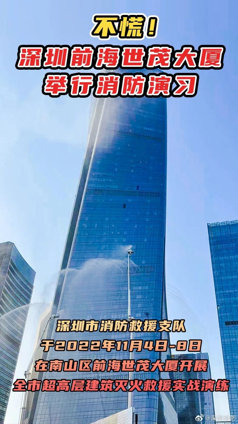 奥一新闻记者从微博平台了解到,11月3日,@深圳消防 发布通知,深圳市消防救援支队于2022年11月4日-8日在南山区前海世茂大厦开展全市超高层建筑灭火救援实战演练!