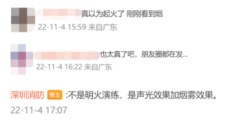 有网友表示“效果逼真”“真以为起火了”,对此,@深圳消防 回复称“不是明火演练,是声光效果加烟雾效果”。