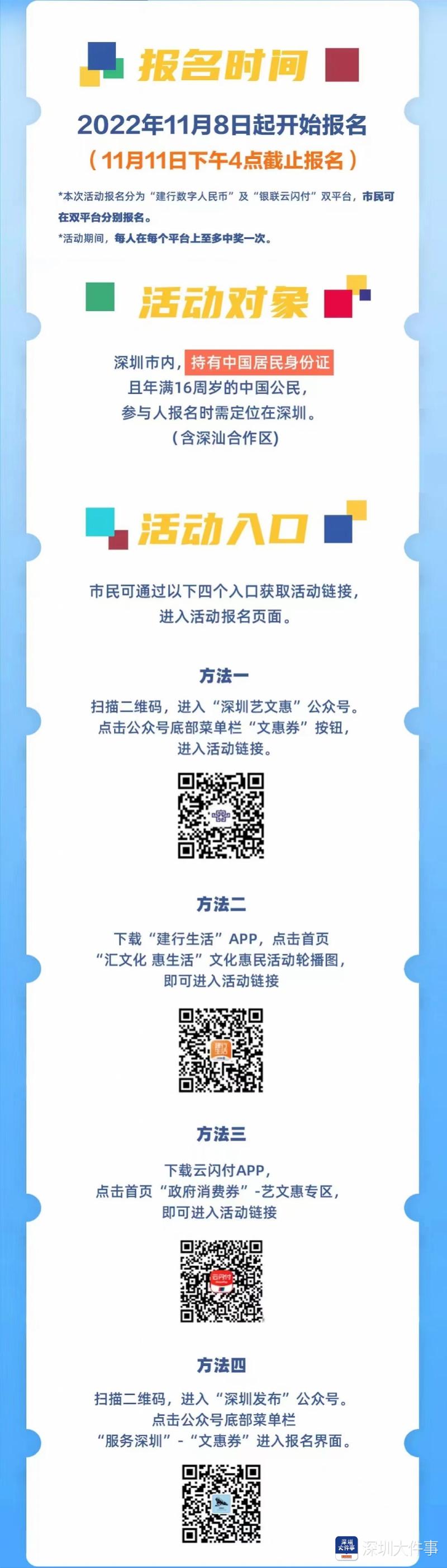 市民可通过以下四个入口获取活动链接进入活动报名页面。方法一,进入“深圳艺文惠”公众号。点击公众号底部菜单栏“文惠券”按钮,进入活动链接;方法二,下载“建行生活”APP,点击首页“汇文化 惠生活”文化惠民活动轮播图,即可进入活动链接;方法三,下载云闪付APP,点击首页“政府消费券”-艺文惠专区,即可进入活动链接;方法四,进入“深圳发布”公众号。点击公众号底部菜单栏“服务深圳”-“文惠券”进入报名界面。