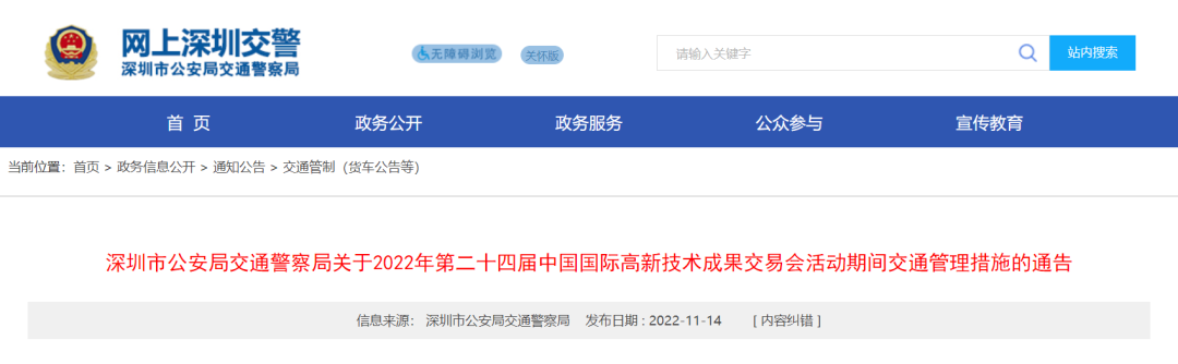 为确保2022年第二十四届中国国际高新技术成果交易会活动期间交通有序、安全、畅通,根据《中华人民共和国道路交通安全法》第三十九条的规定,我局将对福田区深圳会展中心周边道路实施交通管制措施,具体通告如下: