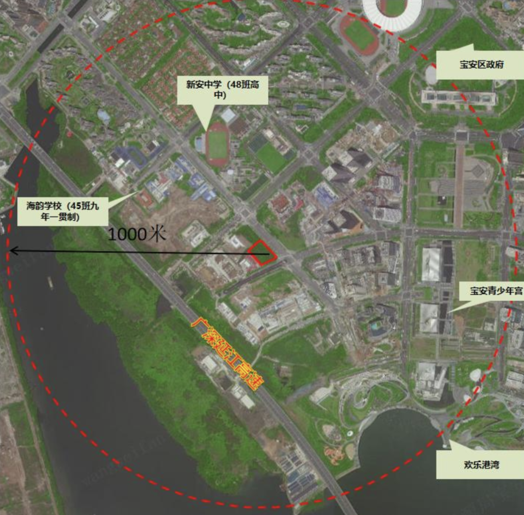 该宗地位于宝安新安街道海秀路和金科路的交汇处,周边有新安中学(集团)和前海人寿金融中心、荣超滨海大厦等办公大楼。宗地占地面积仅5425㎡,是本轮挂牌地块里,面积最小的一宗,总建面约3.25万㎡,起拍价为5.22亿,封顶价为6亿。