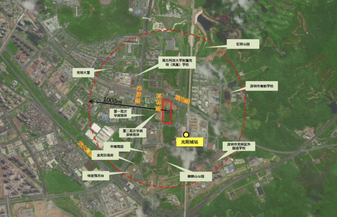 该宗地位于光明城站旁,光侨路和观光路的交汇处。地块占地面积约2.85万㎡,总建面约16.23万㎡,起拍价为31.62亿,封顶价为36.36亿。