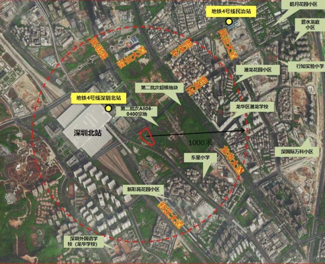 该宗地在龙华玉龙路和民塘路的交汇处,比前几轮土拍出让华润401地块、中海地块更靠近深圳北站。