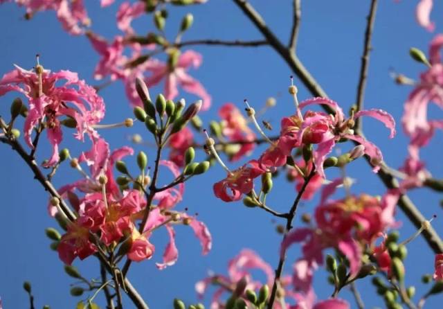 笔架山公园种植的日本丝木棉在阳光雨露滋养下,近期陆续绽放,粉红色的鲜花挂满枝头,绚丽耀目,异常美丽。