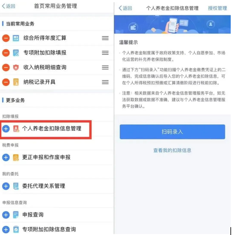 此前,个人所得税APP进行了版本更新,办税频道增加了“个人养老金扣除信息管理”功能,支持扫描个人养老金缴费凭证二维码以录入相关扣除信息。