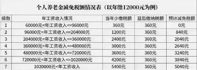 在不考虑其他扣除的情况下,按照一年缴纳12000元个人养老金计算,税前年收入9.6万—20.4万元者一年可节省个税1200元,如果税前年收入102万元以上,一年可节省个税5400元。