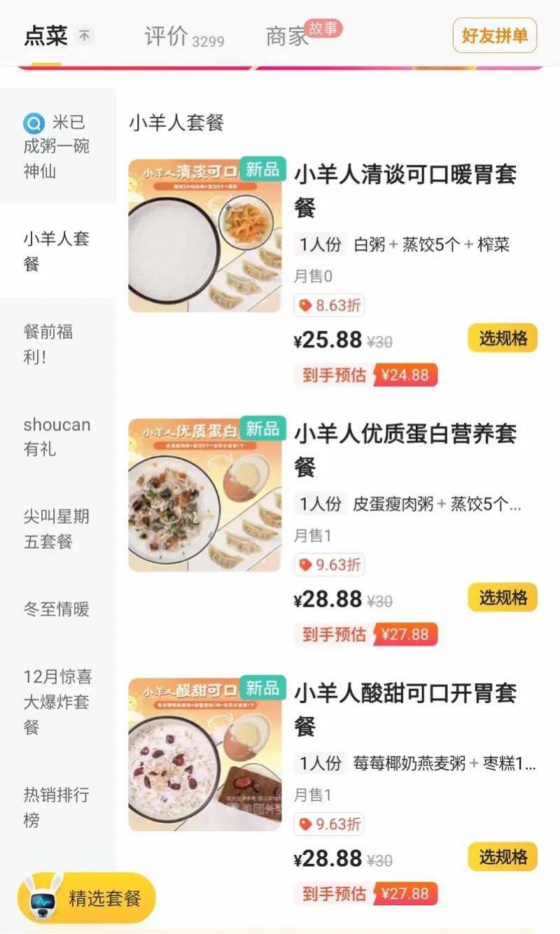 南都记者从线上外卖平台上注意到,连锁粥店“米已成粥·一碗神仙粥”在 深圳、东莞、福州等多地的门店推出“小羊人套餐”, 套餐主要分为三种样式,内含白粥、蒸饺、燕麦粥、枣糕等。