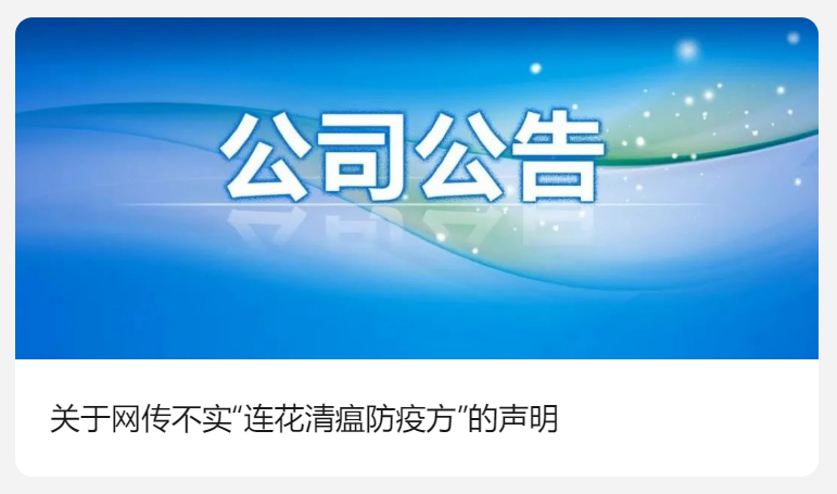 以上文章中与公司有关的内容均不属实。公司从未公布如文章所列“连花清瘟防疫方”;保留追究侵权人、制造、传播谣言的人相关法律责任的权利。“连花清瘟”配方系公司发明专利(专利号03143211.5),该配方与文章所列“配方”在药味组成、处方量和制备工艺都不同。