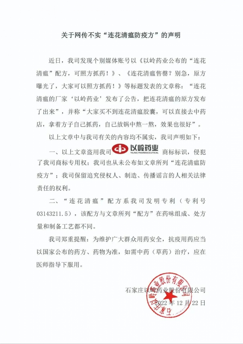 12月22日, “以岭药业订阅号”微信公众号发布声明称,近日,公司发现个别媒体账号以《以岭药业公布的“连花清瘟”配方,可照方抓药!》《连花清瘟售罄?别急,原方曝光了,大家可以照方抓药!》等标题发表的文章称:“连花清瘟的厂家'以岭药业’发布了公告,把连花清瘟的原方发布了出来”,并称“大家买不到连花清瘟胶囊,可以直接去中药店,拿着方子自己抓药,自己放锅中熬一熬,效果也很好”。