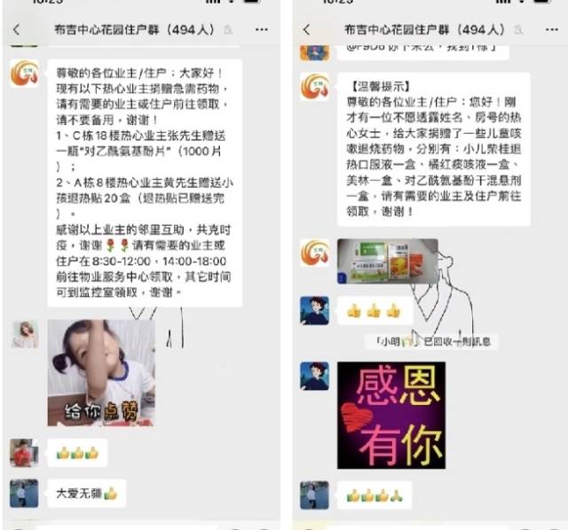 “共享药箱”设立不到一周,布吉街道各小区里的住户们就已经实现了多次邻里医药互助。得知“共享药箱”里有体温计,茂业社区康达尔花园的住户“Mia”在群里求助“谁帮我带一支,动不了。”“R.Y小怪兽”很快就回复说:“我给你带。”12月23日,可园社区的几个党支部和物业服务企业在管理处联合设立了“共享药箱”,3A的住户知道后,第一时间表态“可以捐出20片布洛芬。”文景社区大世纪居民群里的“张伟槟”得知药物紧缺,也表示带了40多片布洛芬放到管理处的“共享药箱”,大家可以按需取用,并且提醒只需要一片,不能多吃。龙岭社区龙岭新村党支部与管理处开展爱心帮扶工作,自发采购药物及抗原放入“共享药箱”。“太感谢小区支部、物业和其他住户的帮助了,家里老人发烧难受,在我们最需要的时候邻里们及时援助,真好!”……这些天由“共享药箱”引发的讨论热闹又温暖,道谢的话语充斥屏幕。