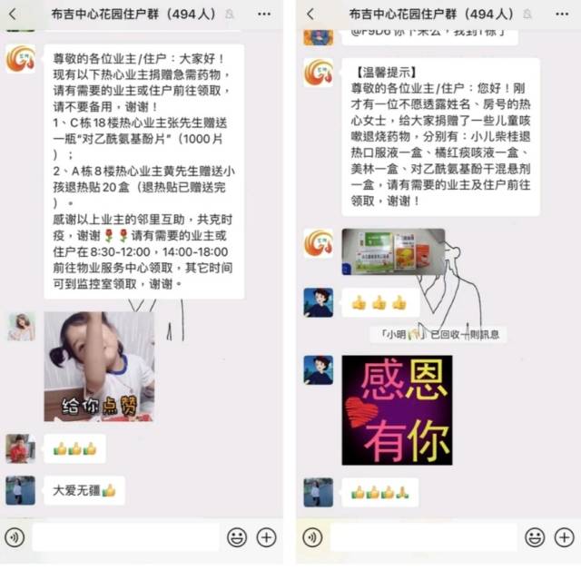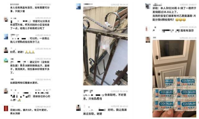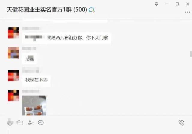 在中央悦城小区业主群中,一位30周的孕妇发烧至38度,在群中求助后不到一分钟,便有住户主动捐出自家的退烧药,还有邻居送药至其家门口,有邻居担心孕妇不敢随便用药,便分享退烧小妙招;还有居民在群里说要将自己家备多的药挂至树梢,若有人需要便来取。