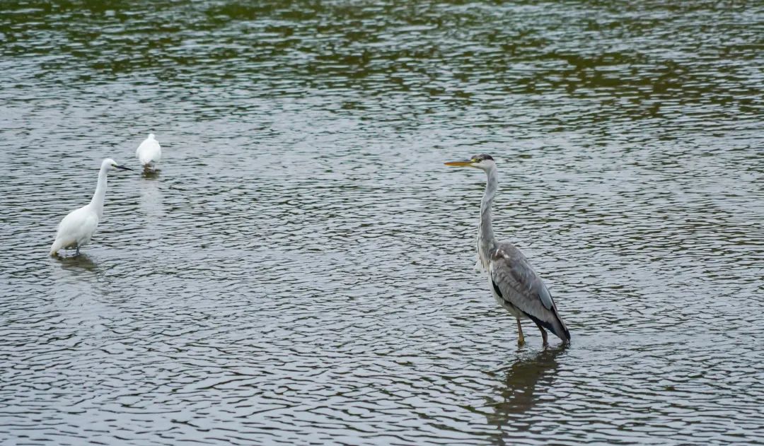 在波光粼粼水面上邂逅的白鹭与苍鹭