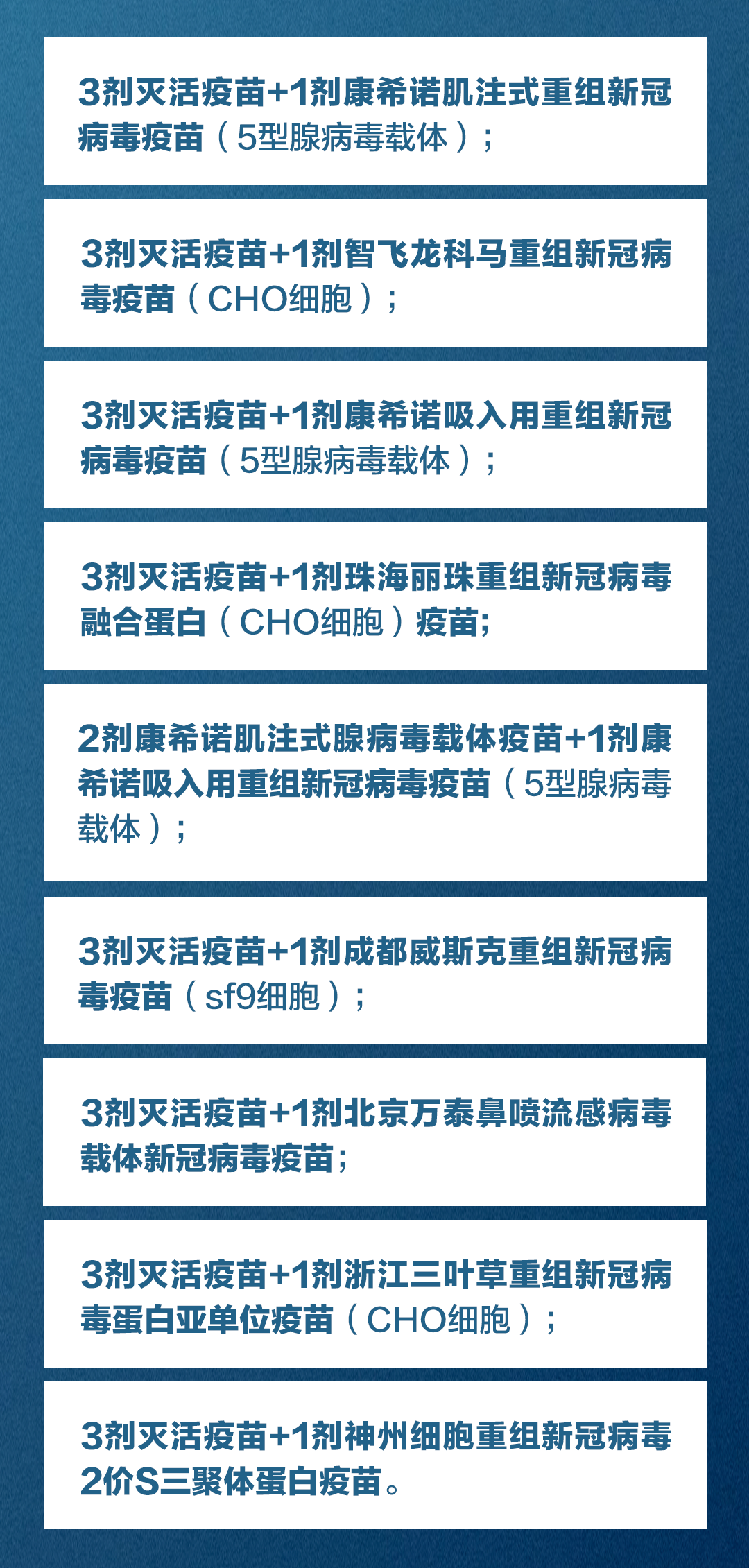 根据疫苗研发工作进展,所有批准附条件上市或紧急使用的疫苗均可用于第二剂次加强针。