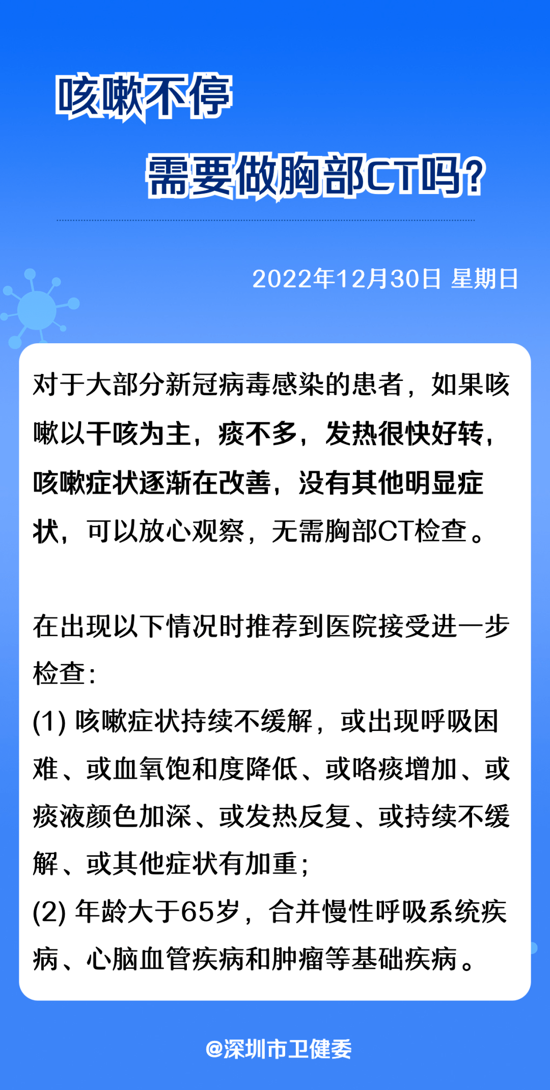 对于大部分新冠病毒感染的患者,如果咳嗽以干咳为主,痰不多,发热很快好转,咳嗽症状逐渐在改善,没有其他明显症状,可以放心观察,无需胸部CT检查。