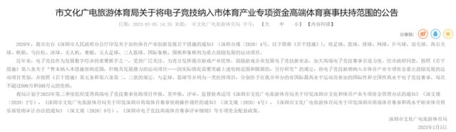 1月5日,深圳市文化广电旅游体育局发布《关于将电子竞技纳入市体育产业专项资金高端体育赛事扶持范围的公告》(公告链接) ,将电子竞技新增纳入市体育产业专项资金重点鼓励发展的运动项目类别。在深圳举办的有国际最高水平运动员参加的国际性和全国性高水平电子竞技赛事,每次将得到不超过800万元和500万元的资助。