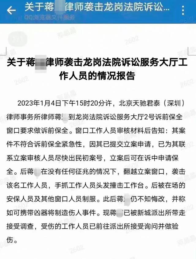 1月8日,两份关于该律师蒋某袭击龙岗区人民法院工作人员的情况报告在网络流传,引发热议。一份落款为1月4日深圳市龙岗区人民法院的《关于蒋某袭击龙岗法院诉讼服务大厅工作人员的情况报告》显示,北京天驰君泰(深圳)律师事务所律师蒋某,于1月4日15时20分许到龙岗法院诉讼服务大厅2号诉前保全窗口要求做诉前保全。后蒋某在没有任何征兆的情况下,翻越立案窗口,袭击该名工作人员,手抓工作人员头发撞击工作台。后被在场的安保人员及其他窗口人员制服,“此后蒋某仍不知悔改,并称可携带凶器制造伤人事件。”文中指出。